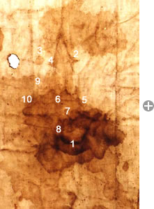 - 4 Skośna linia, zgodna z jasnoczerwoną kreską na Świętym Obliczu