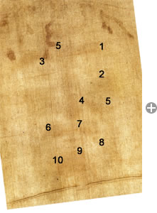 - 1 Przerwa między dwoma widocznymi na Sudarium zębami